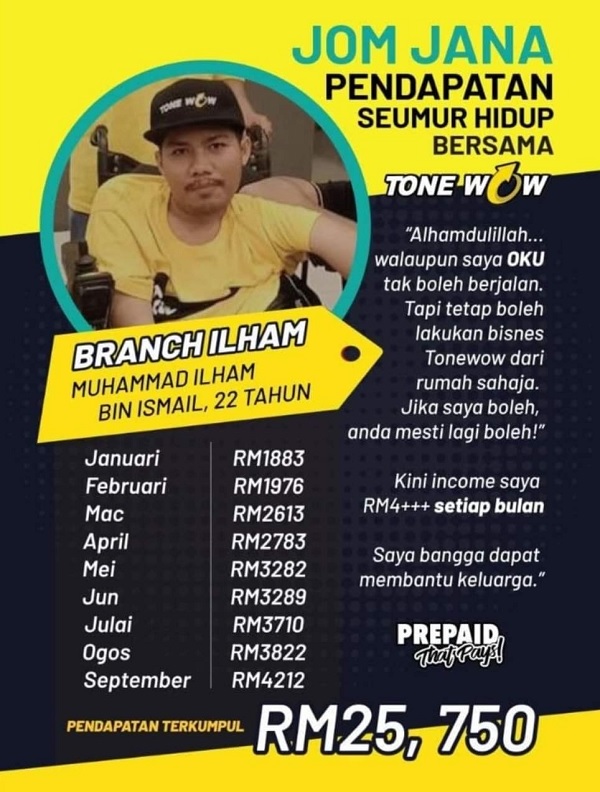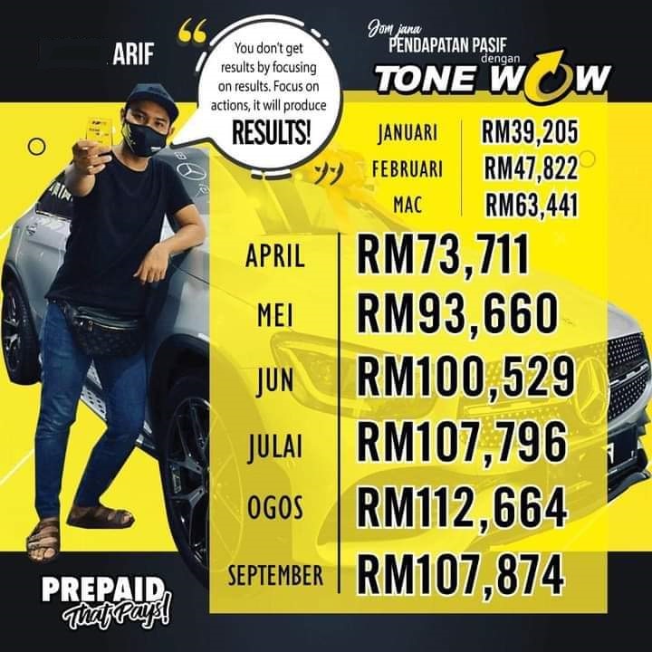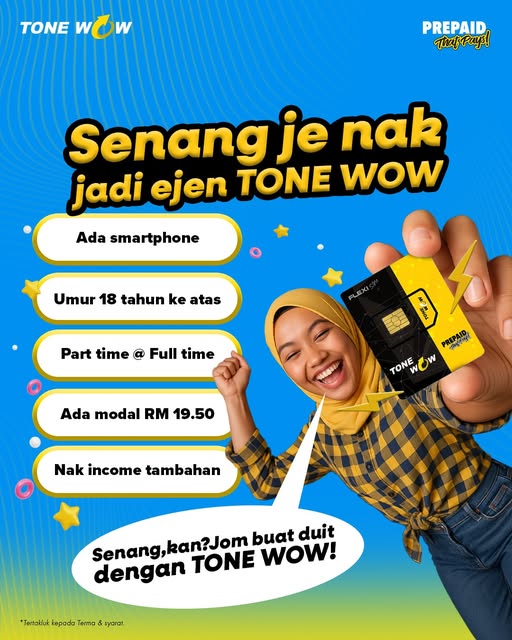 Prepaid boleh jadi income? Boleh sangat! Guna macam biasa, kongsi je experience anda dengan orang lain. Bila mereka pun mula guna, TONE WOW terus bayar anda! Semudah tu nak jadi ejen.